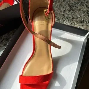 Selling these beautiful tomato-red microsuede sandals. Heel is 4 inches tall. Worn once for photos on my driveway, only. Comes in original box.