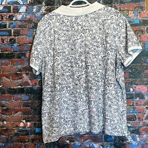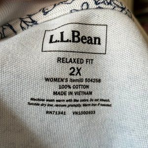 This sporty floral polo from L. L. Bean in white and navy is in excellent used condition. Material is 100% cotton. Shape of the shirt is relaxed fit. Care instructions: machine wash warm with like colors and tumble dry on low, remove promptly. Banded sleeves, stiff collar.