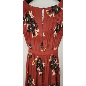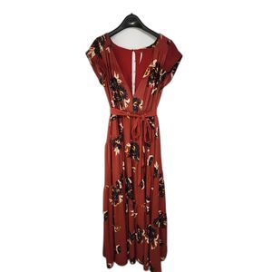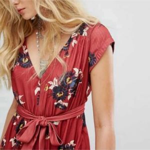 Free People All I Got Tiered Red Floral Maxi Dress Size 2. V-neck, button closure on back, tie around waist, smocked shoulders with cap sleeves, and angled tiers. Dress is lined to about knee length. . Excellent condition except for missing one button on the back. Retails for $168.