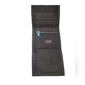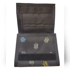 The wallet is the classic tri-fold wallet in black nylon. It has the multicolor bandana print, the logo at the front. The inside has a zipper pocket, 4 card slots, and a bill section.