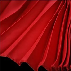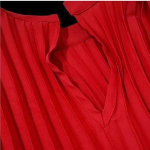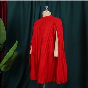 Make a statement in this 100% Cotton accordion pleated cape dress in a bold red. Pull on style, mock neck, sleeveless. Features cloak sleeves in a relaxed fit. Short to show off your legs. Pair with scrappy heels, statement earrings and a top knot.