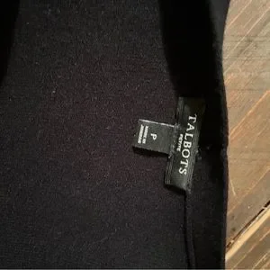 Open black Talbots cardigan with white trim. New condition, size POS, 71% viscose, 29% nylon