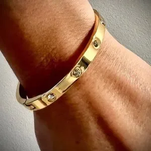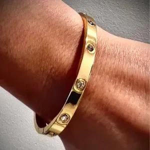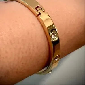 Designer look! Beautiful high shine polished oval gold bangle bracelet with sparkly stones. Like new! It’s about 6mm wide. Laying flat it’s about 2.25” X 2”. Please check your size before purchasing. Hinged opening that opens wide to put on easy. Solid stainless steel and real 18k gold electroplated. The bracelet is strong. Stones are inlayed with a bezel style setting. The listing is for the gold bangle bracelet only! Other jewelry im wearing is also for sale. Some not listed like the big DY one. Comes in a gift box or velvet pouch! A beautiful addition to your jewelry collection!