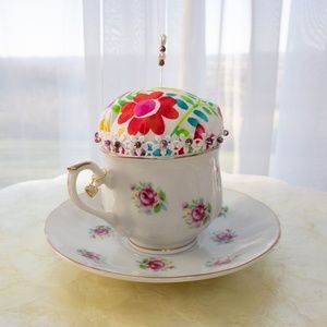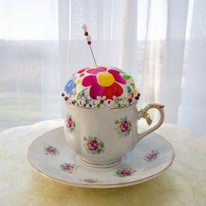 Classic Teacup And Saucer Pincushion Upcycled FTD Teacup And Saucer NWOT