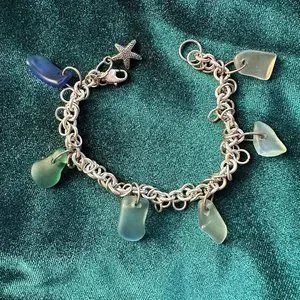 Lovely beach glass dangles from a nicely weighted silver chain bracelet