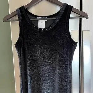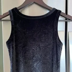 Vintage Y2K black velvet dress made by Le Chateau Jr.. Has a subtle paisley pattern, gems around neckline and string should you like to add a belt. Tagged as a juniors size large. Measures 14.5" pit to pit, 10.5" across shoulders, 14" waist, 17" hips, 48" long.