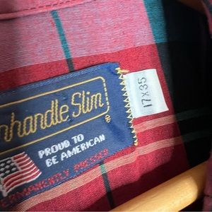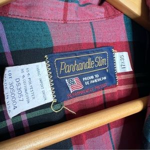 This men's button-up shirt from Panhandle Slim features a vintage plaid pattern with pearl snap closures. The long sleeve shirt is made for casual occasions and has a slimming fit. It comes in a multicolor design and is perfect for those who love the Western theme. The shirt is size 17x35 and is a regular fit.