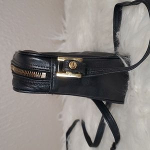 Vintage MCM black crossbody with black coated canvas exterior and black leather trim and details. Gold tone hardware with some tarnish. Strap is adjustable. Interior is smooth grained leather. Made in German stamp is present but faded as indicated in the photos. Both the interior and exterior show signs of age and use, but in overall nice condition.