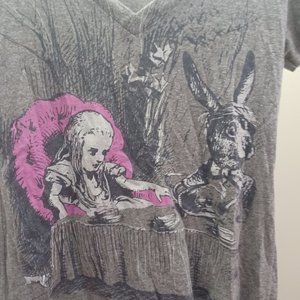 Since 2010, Out of Print’s mission has been to spread the joy of reading by transforming literary classics into bookish apparel and accessories. This shirt depicts images from the first edition of Alice's Adventures in Wonderland.  Women's large, deep V neck, light weight tee.