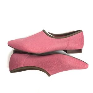 Size 9M/40. These are NWOT Lori Goldstein classy flats. A gorgeous soft rose on a stretch knit fabric. They come with a pointed toe with olive trim, and a 3/4” heel. The outsole is leather and textured and comes with a textile upper/lining. Nicely padded insole. Pretty color combination. Classy, casual/dressy, office, imported.