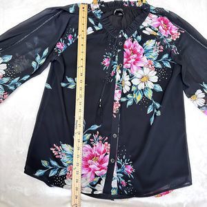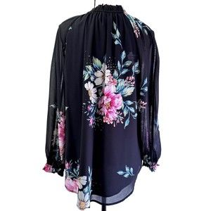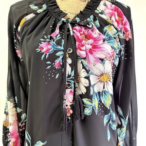Elevate your wardrobe with this stunning Yumi Kim silk blouse. The tie neck with a ruffle accent and a button closure adds a touch of elegance to this chic top. The black chiffon fabric with pink floral print and puff sleeves make it a perfect choice for any occasion, whether it's a party, formal event, or a casual day out.