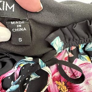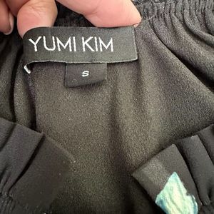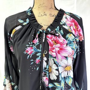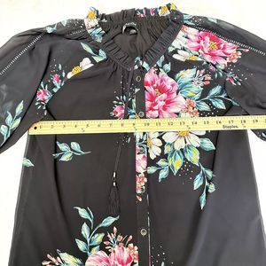 Yumi Kim Women’s Silk Blouse Sz S Black Pink Floral Print Tie Ruffled Neck
