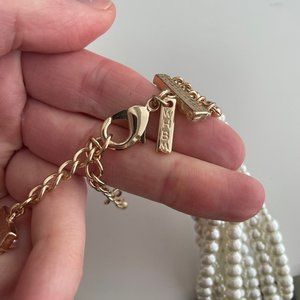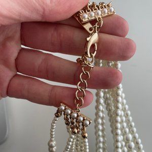 Gorgeous (and heavy) glass pearl statement necklace featuring 7 strands of faux pearls ranging from 18-36" long. Has adjustable lobster claw closure with chain. Please reach out with any questions, thanks for looking!