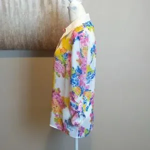 New with tags. This Kut from the Kloth button down top has a beatiful colorful floral print on a semi-sheer material. There is a small snag on the back left shoulder as shown in the 4th photo.