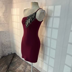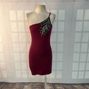 Sky maroon one shoulder embellished leaf beaded mini tunic dress