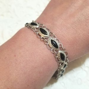 Pretty Vintage Sterling Silver Filigree Bracelet with Pretty Genuine Marquise cut Black Onyx cabochons. Very Feminine and yet Striking! In Great Vintage condition. Measures 7.25" long and .5" wide. The hallmark reads 925 ND. You'll love this Vintage Treasure to add to your Jewelry wardrobe.