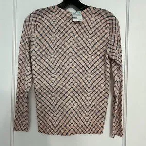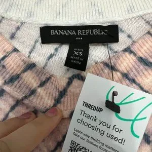 Lightweight cotton pullover sweater from Banana Republic. Has a tag from ThredUp, but no tag from Banana Republic (not sure what that means from the ThredUp perspective, but my loss is your gain!). The pattern is hard to classify, technically it would be batik, but it reads sort of snakeskin. The background fabric is light pink, and the lines are grey.
