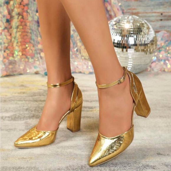 Ladies' Gold Pointed-toe High Heels With Ankle Strap And Cut-out Design