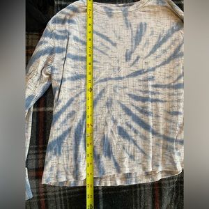Super cute bluish colored long sleeve Tye dye lucky brand shirt has a soft ribbed knitted look to it but still looks warm , scoop neck. Washed in non scented soap, non smoking home . Measurements in pics