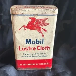 Vintage Mobil Lustre Cloth S/V design A-381 made in the USA By The Makers MOBILOIL Socony-Vacuum Mobil Incorporated tin with cloth. Features the iconic Pegasus logo as well as use directions. See photos for details (dents and surface rust). Great look for decor in used condition