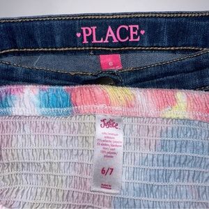 2) Place jeans skirt. Two functional snaps on front. Two flat pockets. Size 6.