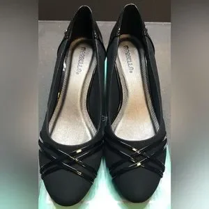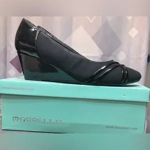 Marbella Julia oat wedges. Size: 8.5 W. Color: black. Condition: pre-owned, excellent. Only worn once for a short period of time. No holes, stains, fading, scuff marks. Comes in original box. Stock #:750516, PO #: 56677. Heal/wedge measurement noted in photos (just over 2 inches).