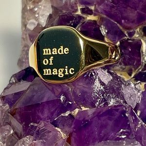 18k gold plated stainless steel signet ring with phrase “made of magic” engraved on it. In sizes 7 and 8. Brand new.