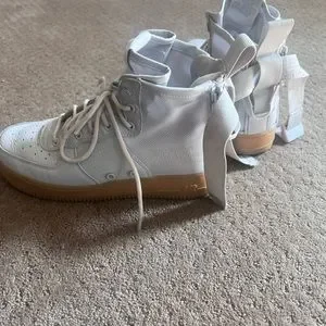 Adjustable ankle strap/buckle, Nike logo on the side, double zipper back closure and lace up