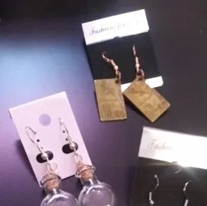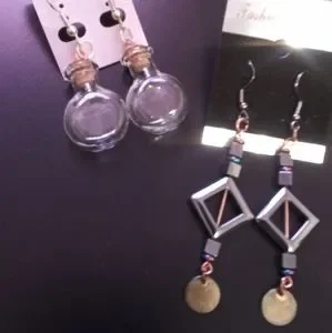 Bundle of 3 beautiful pair of Earrings. one pair is a copper metal envelope, one pair is mini glass bottles with corks and the other pair are long dangling Boho Style.