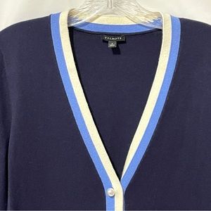 Talbots sweater, size S, cardigan style, navy blue with light blue and cream trim, the faux pearl buttons are so cute! Measurements in photos! Gently preloved!