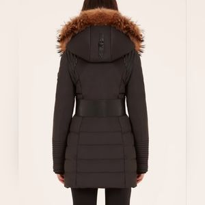 Moda is a contemporary down parka meant for the coldest of days. Featuring a waist-defining silhouette, oversized raccoon-fur-trimmed hood and storm cuffs, it is enhanced with a leather trim ando a detachable leather belt and ribbing around the waist. Wear it loose for sportier look or cinch the belt to create an elegant hourglass shape.