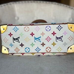 Extremely rare and coveted Louis Vuittion Murakami Multicolor Trouville. Perfect for any true LV collector or statement work bag. The canvas is still bright and beautiful. The interior features a luxurious red velvet with 2 slip pockets. There is also a large exterior slip pocket and gold hardware accents. Add an after-market strap to make into a crossbody.