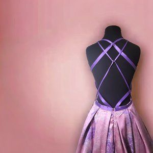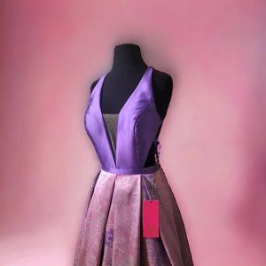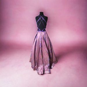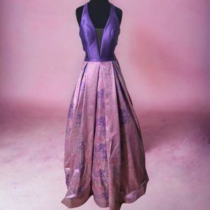 Morrell Maxie A-line ball gown is Mikado/Metallic Jacquard Print Criss Cross open back plunging V-neck dress. New with tags size 2 and 10.