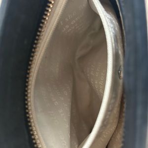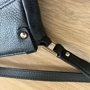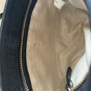 Kate Spade black leather crossbody purse. Normal wear to leather/softened leather. Inside has one small green spot. It is likely from the metal emblem. Great everyday bag. I used this for a girls trip to Spain