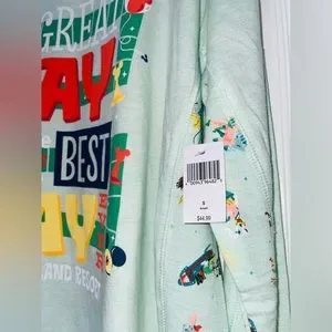 Green/white heathered Disney character “It’s a great day to have the best day ever at DisneyLand Resort” long sleeve tshirt. Loose fit. Longer in back than front. Raw seams. Character paneling on insides of sleeves and sides of body. Size small. Made of 69% Viscose, 27% Cotton, 4% Elastane. New with tags.