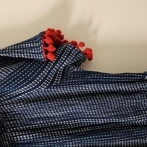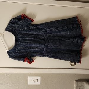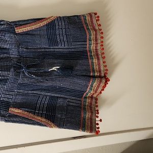 Gently used. great condtion. has a small flaw on few stiches. cotton. romper. size M. multicolor. strechy waist and of shoulders. elastic shoulders. measurements aprox with out streaching:
