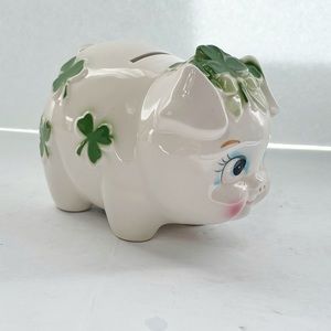 Vintage Lefton Shamrock Piggy Bank. Hand painted. Pink cheeks. Blue eyes. Eyebrows. Features charming Irish shamrock clover design, making it a unique addition to any collection.