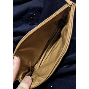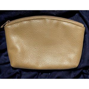 Classic and versatile tan leather toiletry pouch. The outside is made of a material that's tan and pebbled, but I'm not sure if it's real of faux leather. (I assume faux.) It has a zip top closure and a smooth interior fabric. The zipper is also tan. The paint where the zipper pull connects to the zipper is flaking off a bit, so you can see the silver metal underneath.
