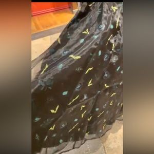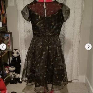 You'll be frighteningly fashionable when greeting foolish mortals in this Haunted Mansion dress. You don't need to be clairvoyant to see that your future will be rosy when you wear this dress inspired by The Haunted Mansion. The attraction's resident medium, Madame Leota, is featured on the allover print on the sheer black top layer, along with bats and other ghoulish sights. You can glimpse through its ghostly veneer to the solid black underlayer beneath.