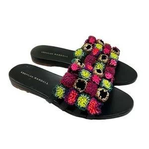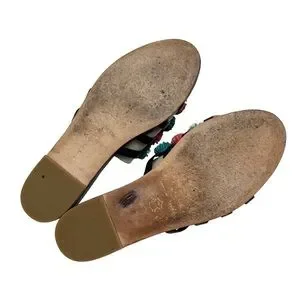These are stunning leather sandals for summer. They have a patchwork pattern of colorful leather poms. The shoes are listed in GUC due to a tad of wear on the tip of the shoes and the soles, along with some marker on the soles (see photos.) They look great overall.