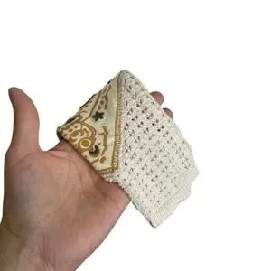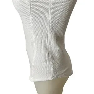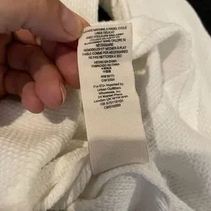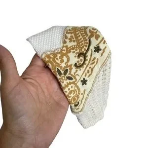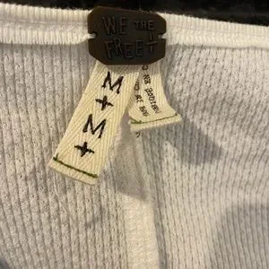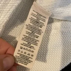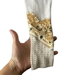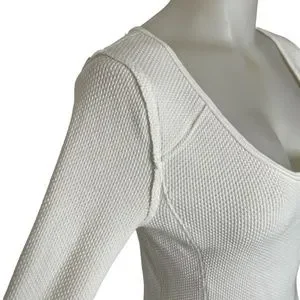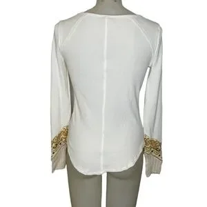 White waffle knit long sleeve top w/ scoop neckline, tailored seams, boho woven appliqué fabric on sleeves and crochet knit detailing at sleeve cuffs. No rips or stains, in excellent condition.