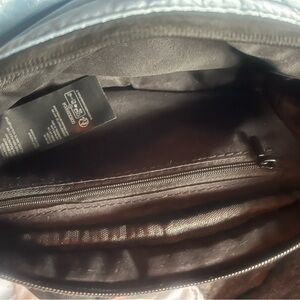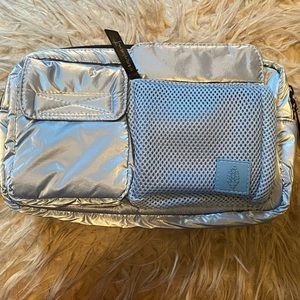 free people movement bag. Wear over the shoulder or on waist. Has 4 pockets and adjustable straps. Icy blue color. Excellent condition. Large inside pocket with additional zippered pocket inside. 2 small front pockets.