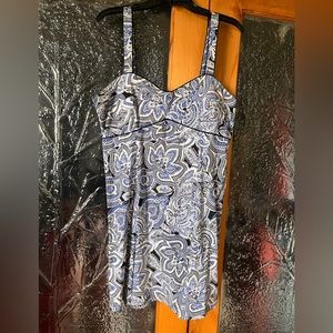 R & K White, Blue & Black Petite Summer Dress. Size 16P. Worn Twice. Button adjustable straps; semi built in bra, zipper back. I’m 5’5 and dress hits me just above knees.