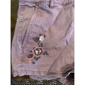 Rose colored shorts with embroidered flowers on the front and back. 3” inseam