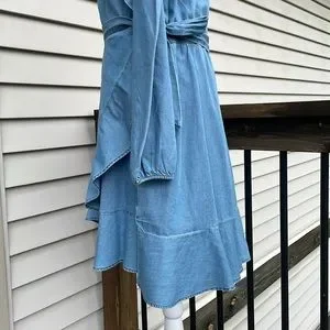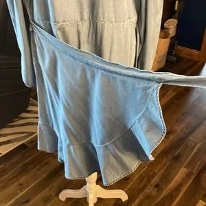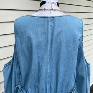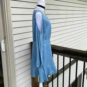 Cute mini, denim blue dress by Express loaded with personality! Allow me to begin! Has a scoop neck, open shoulders, long sleeves, a flared skirt, elastic at the waist along the backside only, a slip-on style, and as I tried to show in the last pic is an apron front that is stitched at the side and comes along the front only and ties along the opposite side to form an apron look! It doesn’t necessarily look like an apron when worn cause it’s all the same fabric and the backside has a belt too but that is indeed the styling of this piece. Gently loved, only worn once, is a cotton/lyocell mix, and is machine washable. Lying flat it measures approximately 36 inches shoulder to hem, 23 1/2 inches armpit to armpit, and 21 inches at the tie waist with an extra inch of length here due to the elastic on the backside. The open shoulders measure about 9 inches lying flat as well.