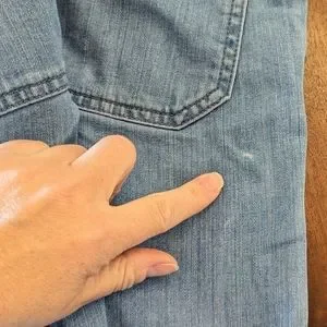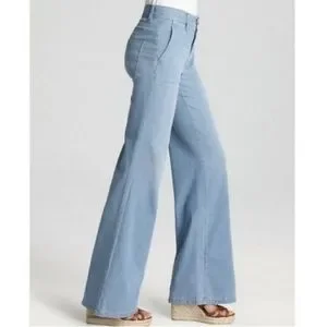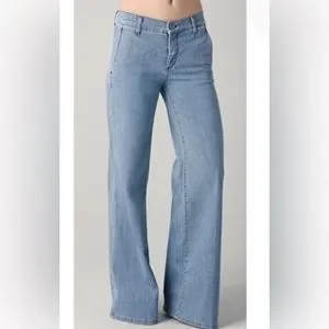 The "Fonda Trouser Jean" from Vince. Wash is "Sky", more accurate in the first 3 pictures. Light and stretchy. Tagged as a 4, measures below were taken before stretch. Overall excellent condition! The last picture shows a tiny light spot I found on the back right. Very minor, all else great.