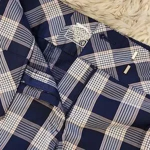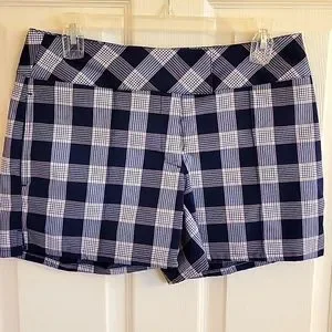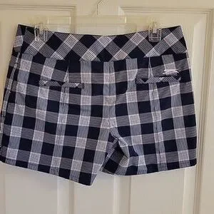 Like new golf shorts in navy, white, orange plaid. overall length 13", inseam 4", flat width at waist.