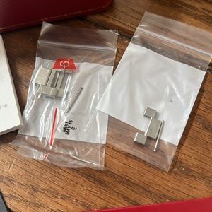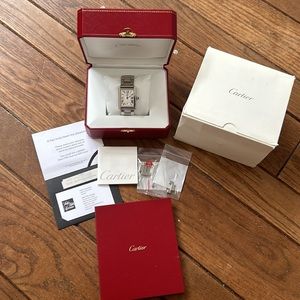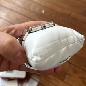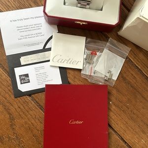 Good used condition with all original things from purchase including receipt, book, extra links, jewelry box and Cartier box. Stainless steel with blue sapphire on dial. 100% authentic.