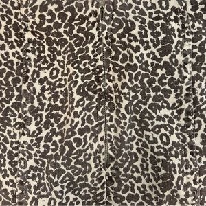 Tight fitting, zip-up back closure, hook and eye closure at top of zipper, leopard print, denim, structured seaming, mini, stretch