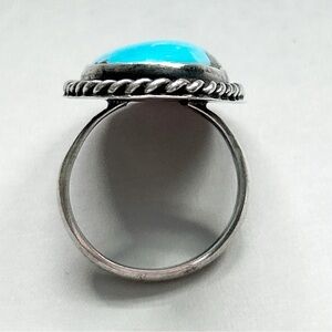 Vintage Southwestern Turquoise Sterling Silver Ring. Gorgeous blue turquoise in traditional design sterling silver setting. Probably Navajo. Turquoise is 13 x 18 mm, ring top is 18 x 24 mm. Not marked, but tested as sterling. Size 6.75 on mandrel. 5.8g